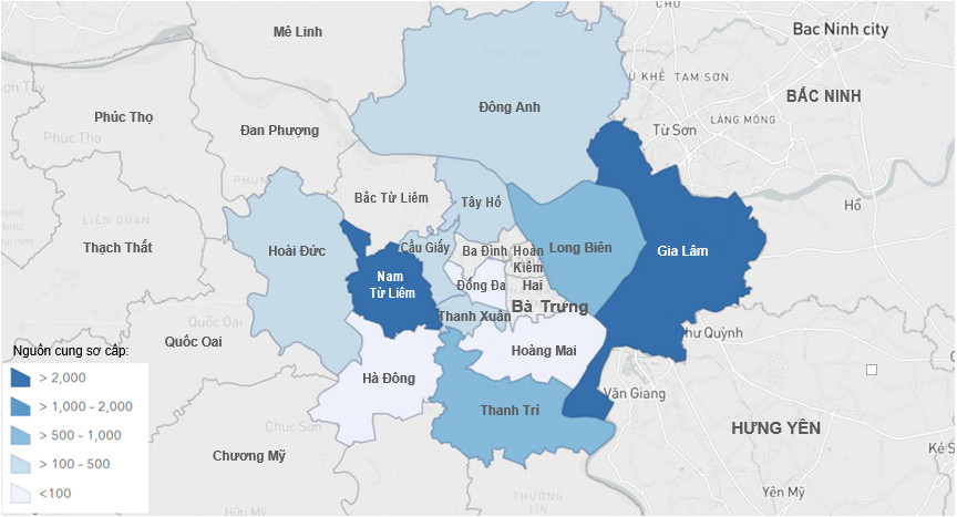 - Tính đến cuối QII/2022, có khoảng gần 50 dự án căn hộ sơ cấp đang mở bán trên địa bàn Tp. Hà Nội, cung cấp hơn 8,400 căn hộ vào thị trường. Hai quận Nam Từ Liêm (khu Tây) và Gia Lâm (khu Đông) chiếm 73% tổng nguồn cung, giữ vững vị thế top đầu trong nhiều quý gần đây.